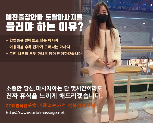 저희 예천출장안마는 최상급의 만족도와 질 좋은 서비스를 제공하기 위해 20대 S급 한국 관리사들을 채용하고 있습니다. 토탈출장마사지는 예천출장안마 업체로서 매일 운영되며, 언제 어디서든 원하시는 장소(원룸, 자택, 오피스텔, 호텔, 모텔 등)에서 호출하시면 30분 이내에 달려갑니다.